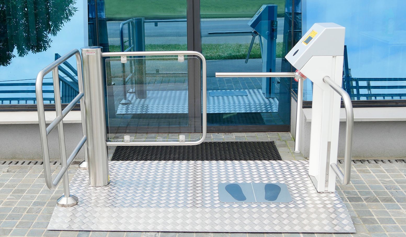Das motorgetriebene hüfthohe Vertikaldrehkreuz AICHACH mit Sperrelementen aus 10 mm Einscheibensicherheitsglas besteht zur Gänze aus rostfreien Materialien und ist besonders für den Aufbau von Sperren in Bürogebäuden und Freizeiteinrichtungen wie etwa Fitness-Clubs geeignet.
