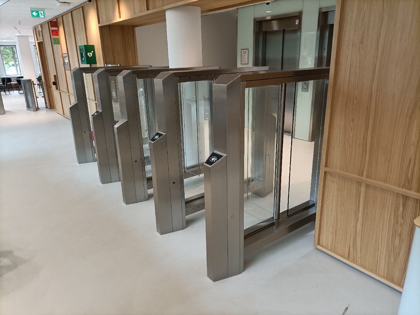 Personenschleuse im schlanken und formschönen Design aus Edelstahl mit verfügbaren Höhen von 1225 mm und 1552 mm. Berührungslose und barrierefreie Durchgangsbreite von 600 mm bis 900 mm, Sensoren überwachen den Durchgangsbereich.